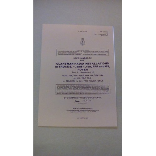 USER HANDBOOK FOR CLANSMAN RADIO INSTALLATIONS IN TRUCK UTILITY,1/2 AND 3/4 TON, TUL AND TUM FFR AND GS, ROVER.