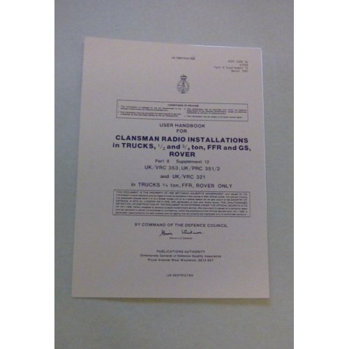USER HANDBOOK FOR CLANSMAN RADIO INSTALLATIONS IN TRUCK UTILITY,1/2 AND 3/4 TON, TUL AND TUM FFR AND GS, ROVER.