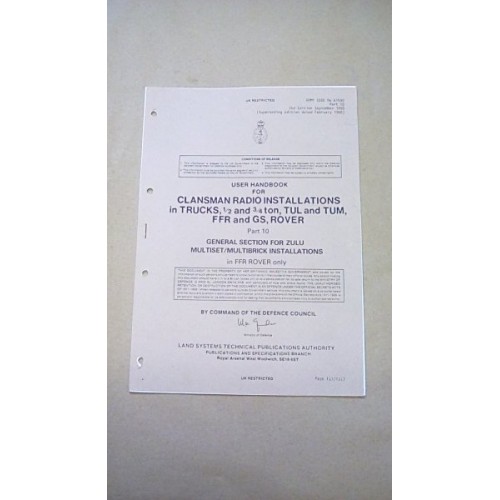 USER HANDBOOK FOR CLANSMAN RADIO INSTALLATIONS IN TRUCK UTILITY,1/2 AND 3/4 TON, TUL AND TUM FFR AND GS, ROVER.